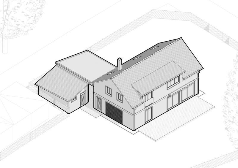 Rodinný dům je řešen s důrazem na propojení obytných prostor se slunnou jižní stranou pozemku, odkud se otevírají výhledy do šumavské krajiny. Dispozice nabízí plynulé návaznosti mezi hlavními místnostmi, velkorysý obývací prostor a variabilní podkroví doplněné pultovým vikýřem. Architektura stavby pracuje se šikmou střechou, světlými fasádami a dřevěnými prvky, které společně vytvářejí harmonický, venkovsky laděný charakter domu i přilehlého skladu s pergolou.