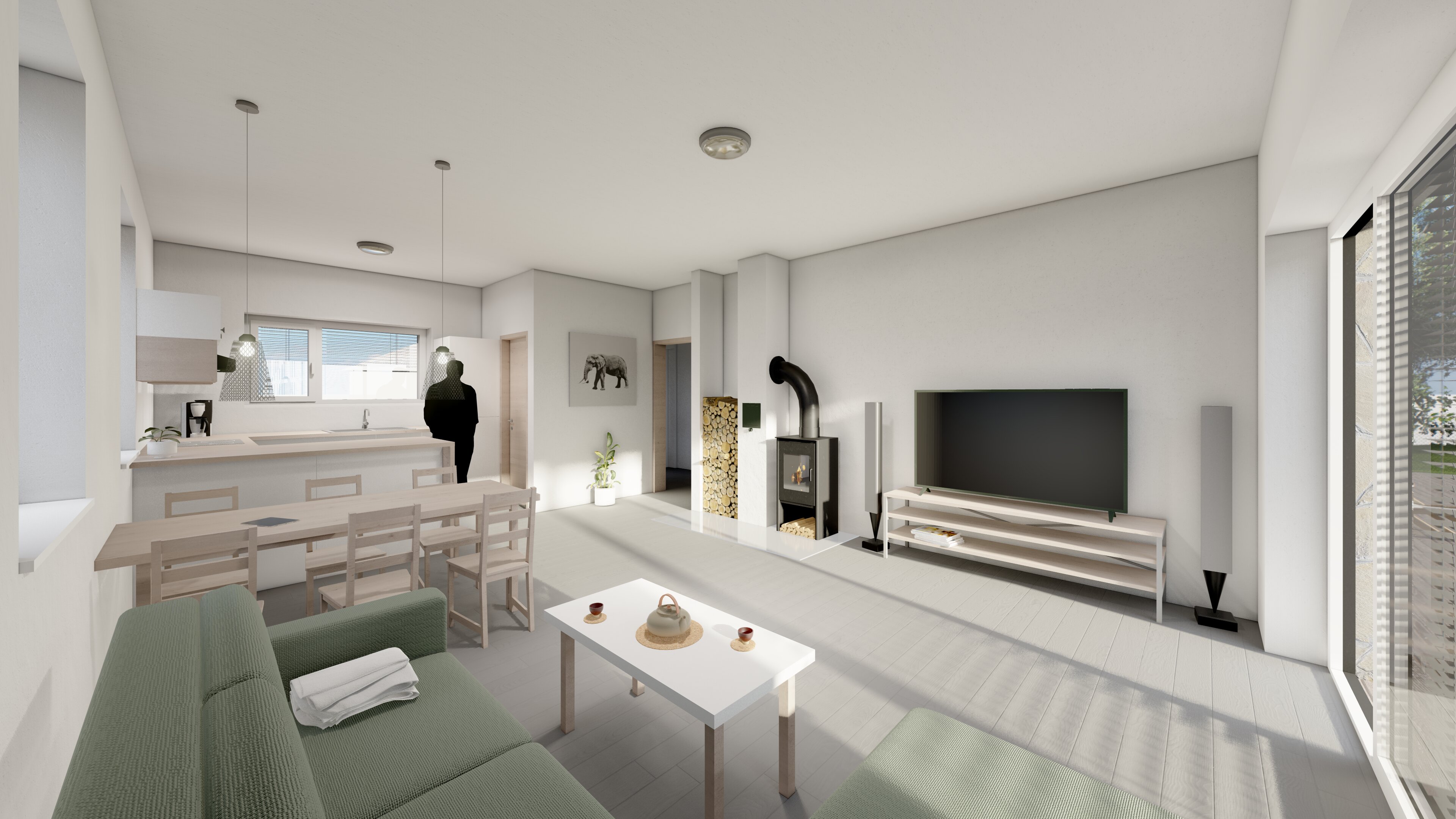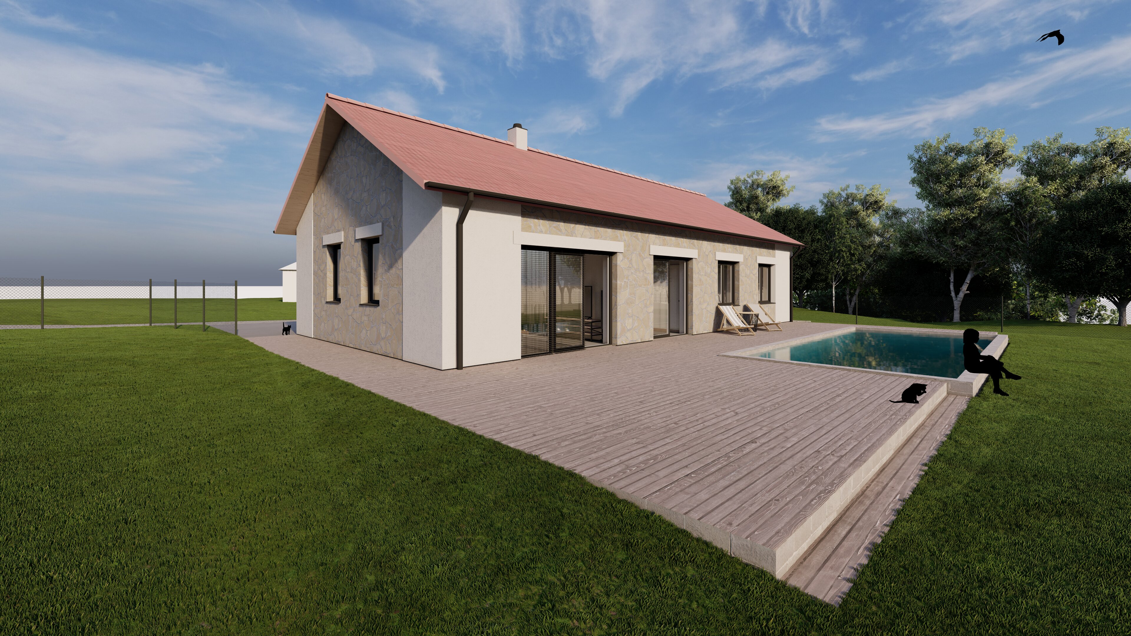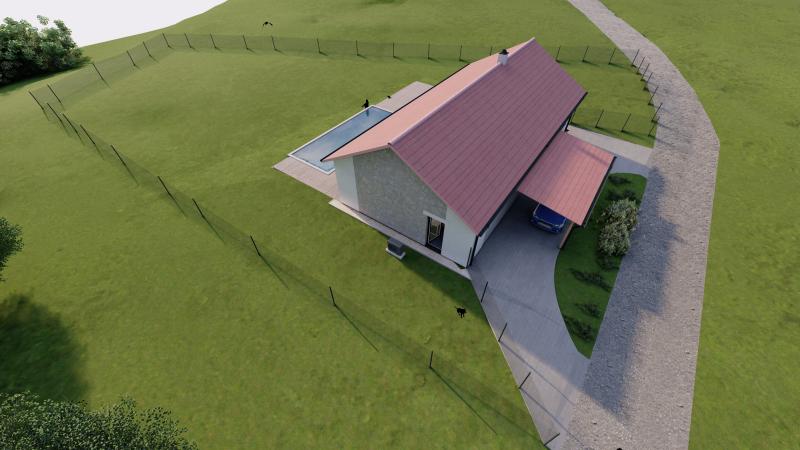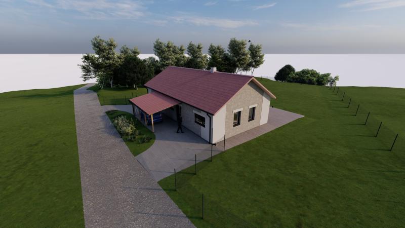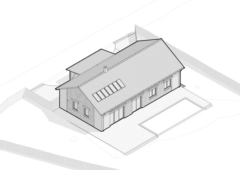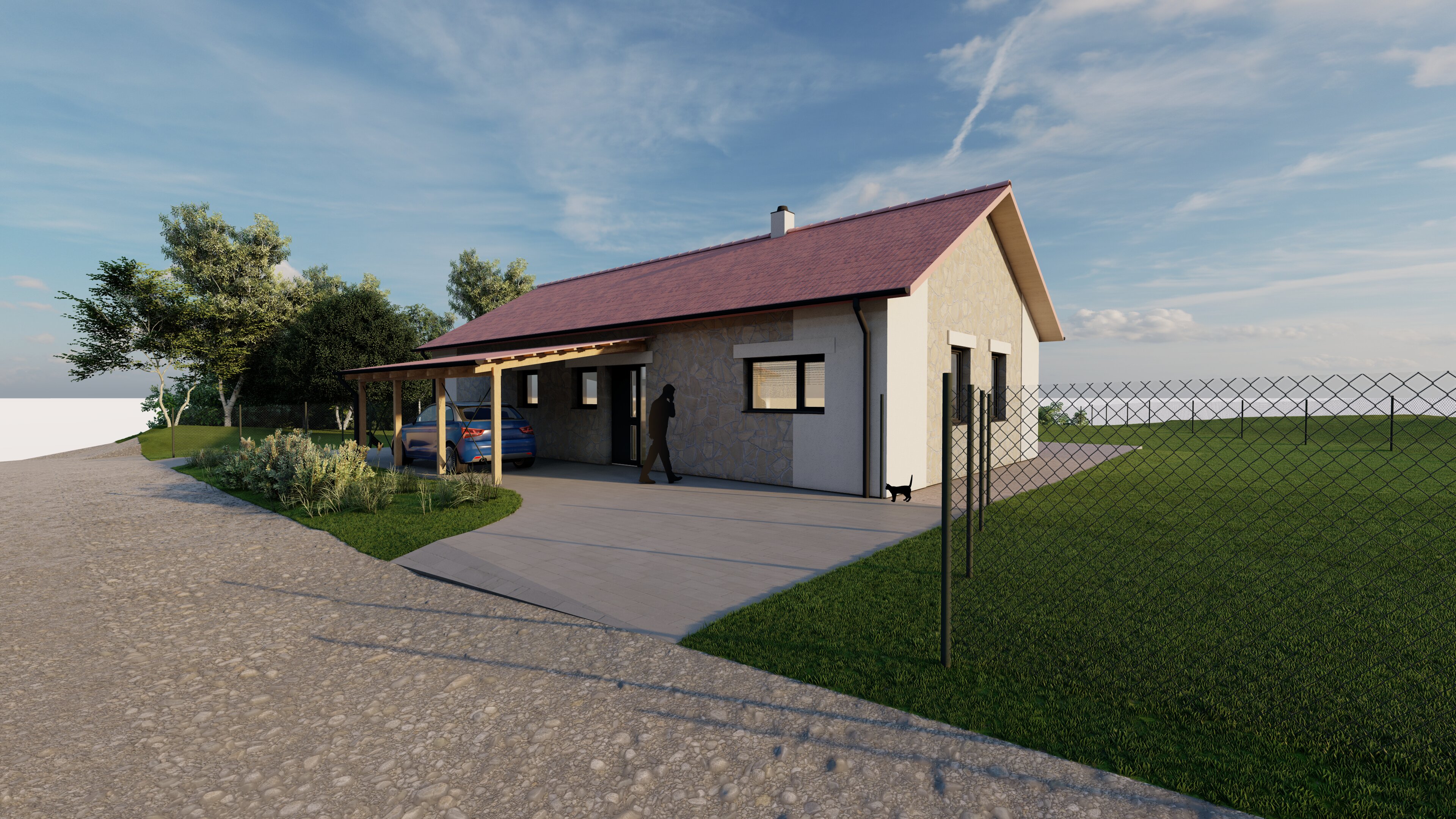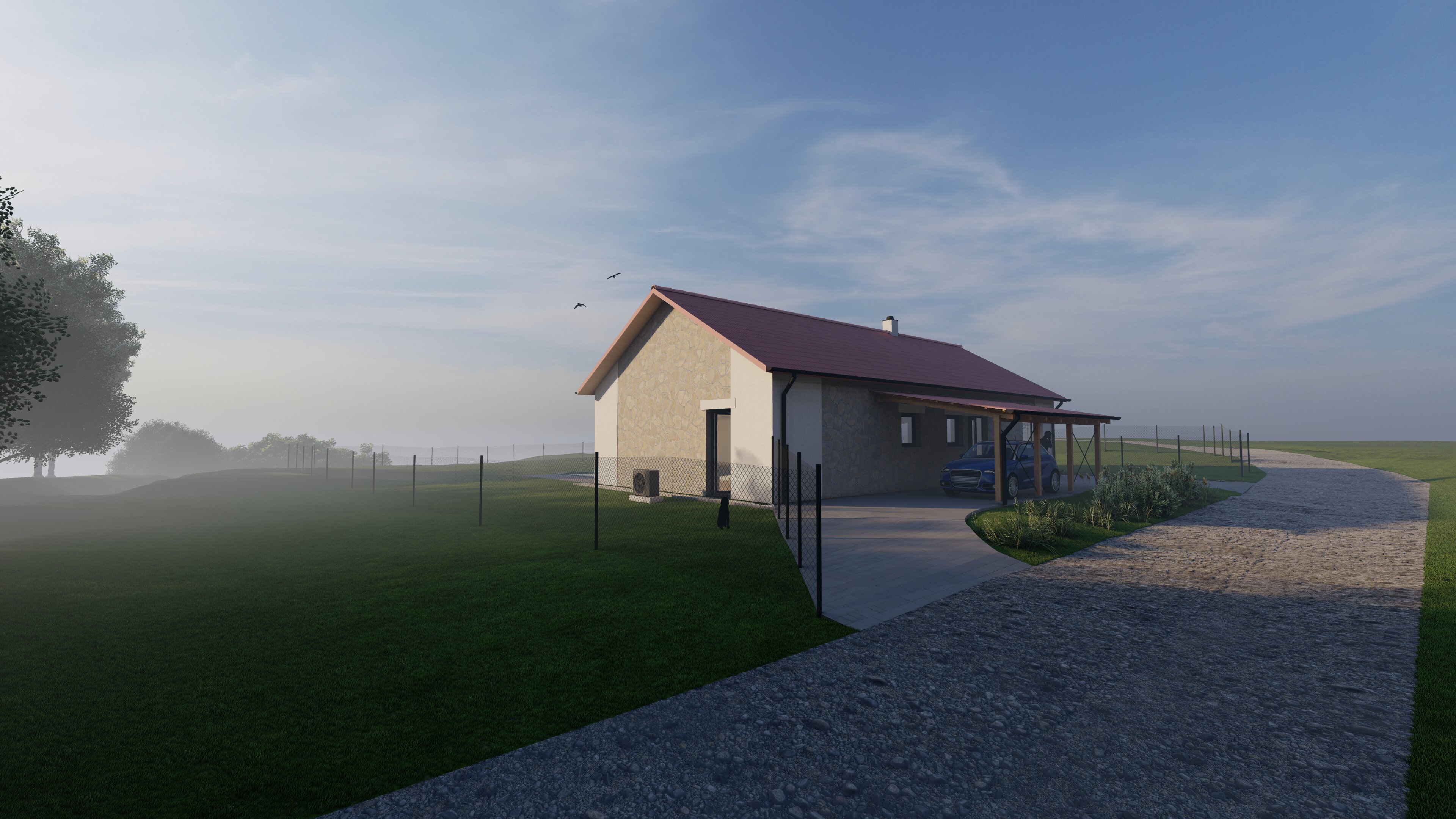 Tato stavba pro bydlení kombinuje jednoduchou sedlovou střechu, bílé fasády a výrazný kamenný obklad, čímž vytváří moderní pojetí venkovského stylu. Centrem domu je světlý obývací prostor s kuchyní, otevřený do tří světových stran a propojený s jihozápadní zahradou. Přehledná dispozice s centrální chodbou zajišťuje plynulý pohyb po domě a pohodlné oddělení jednotlivých obytných místností.